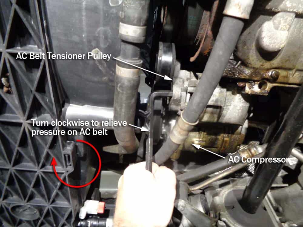 - The first belt to be removed from your vehicle is the AC accessory belt. You will need to remove the pressure being put on the AC belt by the belt tensioner pulley so the belt can be removed. There is a recessed torx (star) fitting on the front of the belt tensioner (see image below). Take a 3/8" hex wrench, insert it into the torx fitting, and use your muscles to turn CLOCKWISE. The pulley will retract downward allowing you to remove the belt. ***The reason we use a 3/8" hex wrench instead of a torx bit is due to clearance issues in the engine compartment. Unless you have a special low profile ratchet or modified torx bit, you will not be able to get to the torx fitting using that combination. The 3/8" hex wrench is easy and works perfectly!