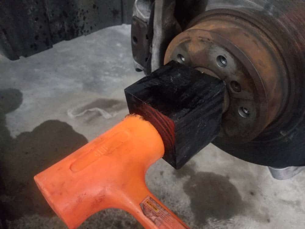 - Using a 4lb hammer and a block of wood strike the wheel hub. Continue to forcefully strike the block of wood until the axle threads protrude out enough to get the axle nut on 1/2 turn. Use a rag to thoroughly wipe off any grease from the threads. Install the axle nut hand tight.