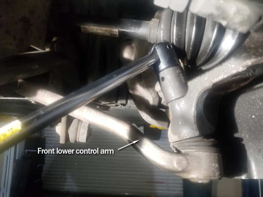- Now move to the front lower control arm (wishbone). The lower control arm is also anchored to the steering knuckle via a ball joint. Use a 24mm socket and breaker bar to first loosen the ball joint mounting nut. Remove the nut from the ball joint.