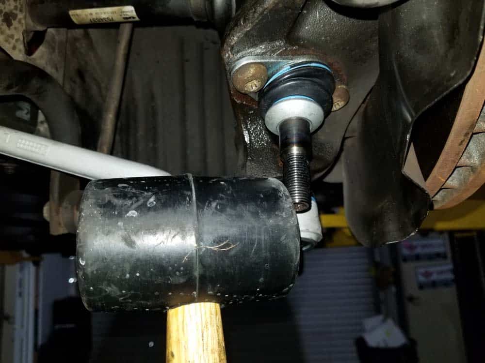 - Turn the steering wheel so you can access the lower control arm ball joint from the back of the steering knuckle (to the right if you are working on the left side of the car). Strike the ball joint mounting bolt with hammer until the ball joint separates from the steering knuckle. When the ball joint is loose you can pull the control arm down with your hand as shown below.