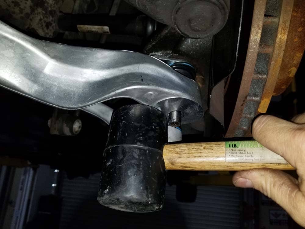 There is a lot of discussion in online forums on how to remove the ball joints when performing a BMW E60 xDrive front control arm replacement. Many of the techniques discussed for removing the front ball joints on the E60 xDrive are very misleading and completely unnecessary. Removing the front control arm ball joints in your BMW E60 only requires the use of a ball-peen hammer and a steel punch; there is absolutely to need to purchase or fabricate special tools to remove them. We show you how to do it in the repair steps below.