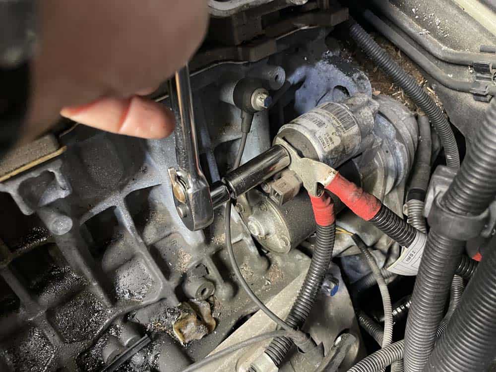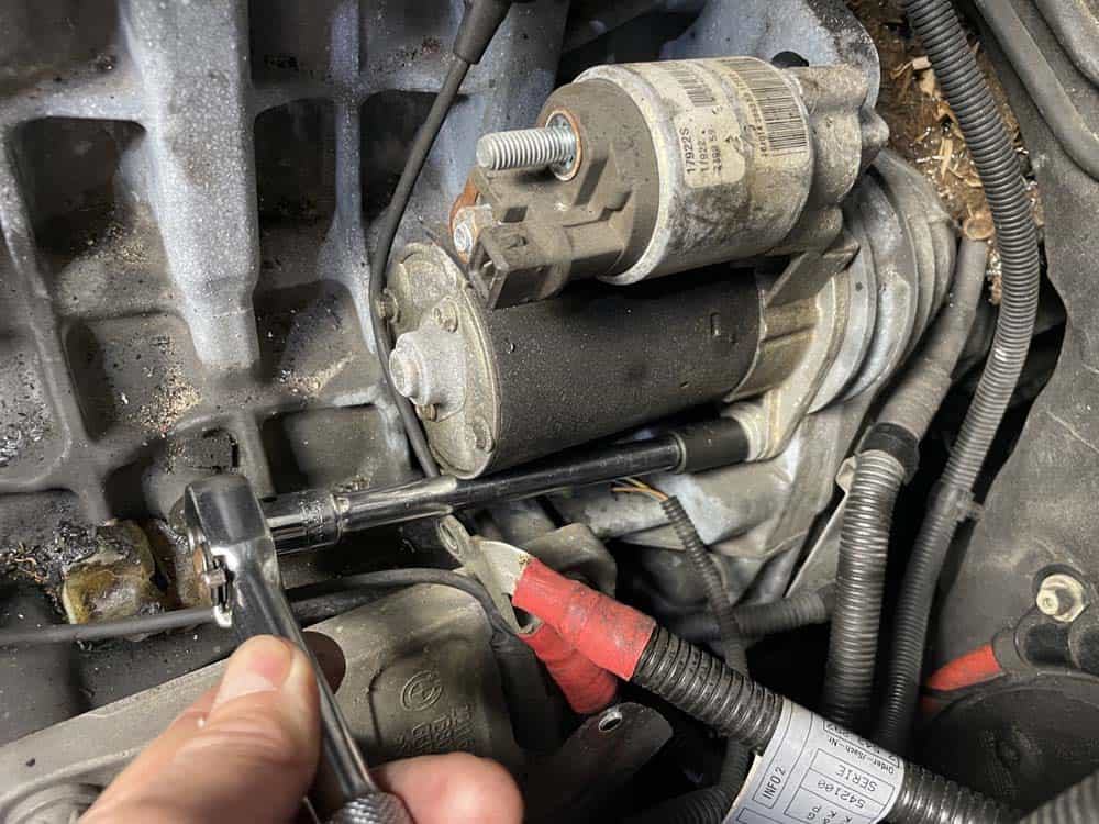 - Use a 13mm socket wrench to remove the positive battery cable from the starter.