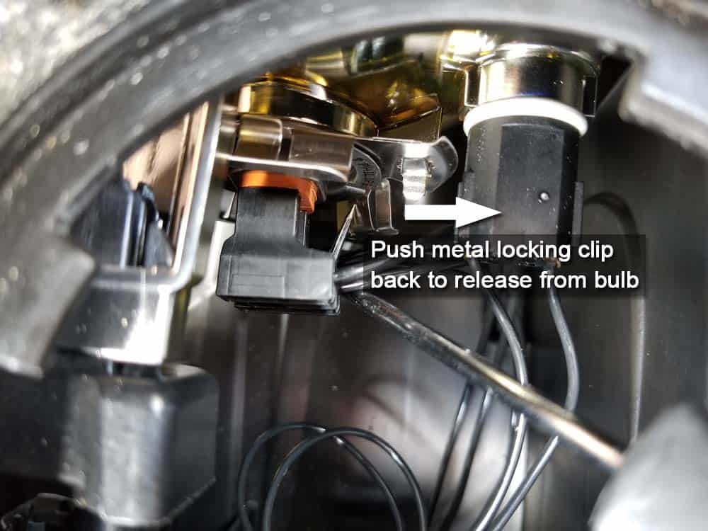 - The high beam bulb is held in place by a metal locking clip. The metal clip must be bent back to allow the bulb to be pulled free from the headlight.