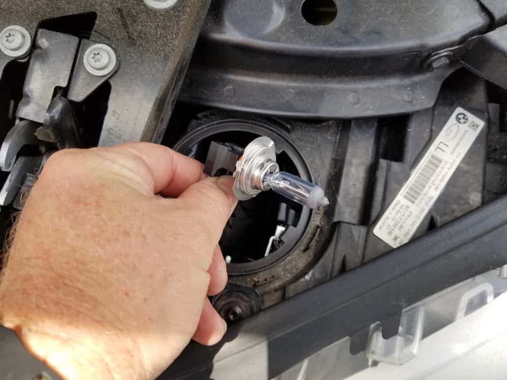 - The high beam bulb in 2012-2019 BMW 3 series vehicles with halogen headlights is removed from the top of the headlight assembly.